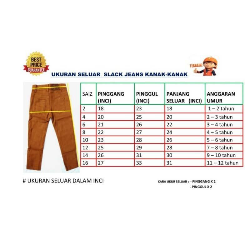 Jadual dibuat dengan mengambil kira jenis pakaian: Anak anda akan nampak bergaya dgn seluar ni walaupon harga murah. Pola jahitan seluar kanak2 seluar pinggang getah saiz dari 1 tahun hingga 12tahun dewasa s to xl tersedia basi jahitan. Plain kelas ukuran bahan pakaian kasual.
